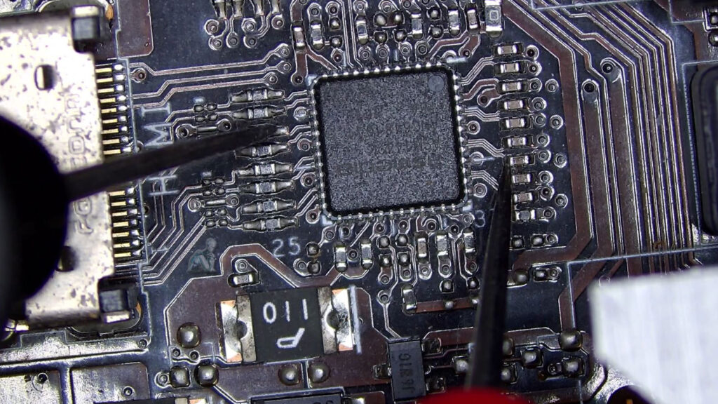 Multimeter probes touching circuit points on a gaming PC motherboard to analyze electrical signals during diagnostic testing